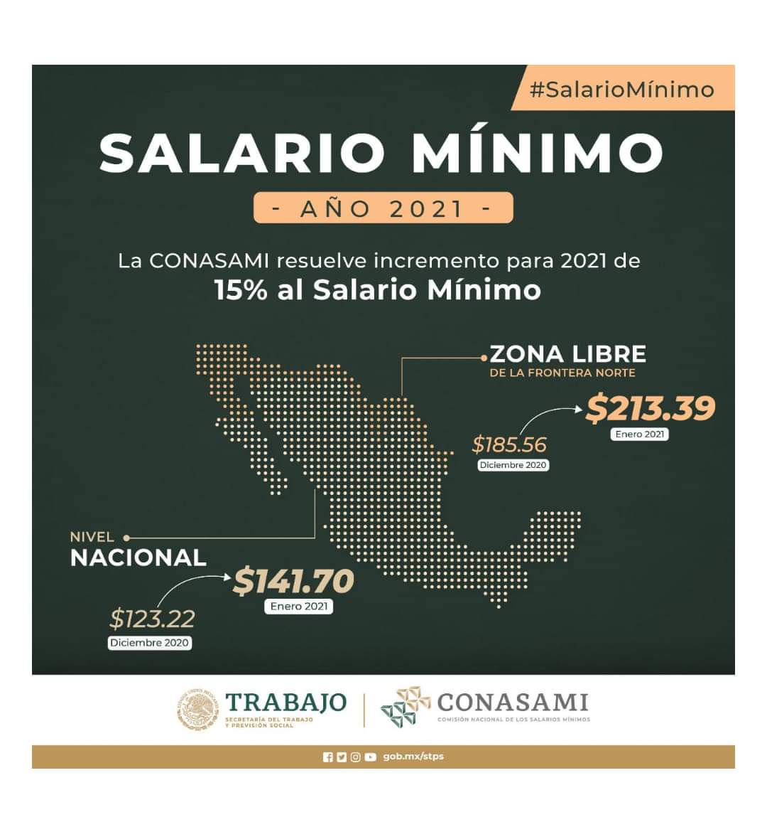 Los salarios mínimos generales que tendrán vigencia a partir del 1º de enero de 2021, se incrementarán en 15%, en las dos zonas descritas en el primer resolutivo, por tanto, serán de 213.39 pesos diarios por jornada diaria de trabajo en el área geográfica de la Zona Libre de la Frontera Norte, cuyo incremento se compone de 15.75 pesos del Monto Independiente de Recuperación (MIR) más un factor por fijación del 6%, y para el Resto del país el salario mínimo general será de 141.70 pesos diarios, por jornada diaria de trabajo, cuyo incremento se compone de 10.46 pesos de MIR más 6% de aumento por fijación.